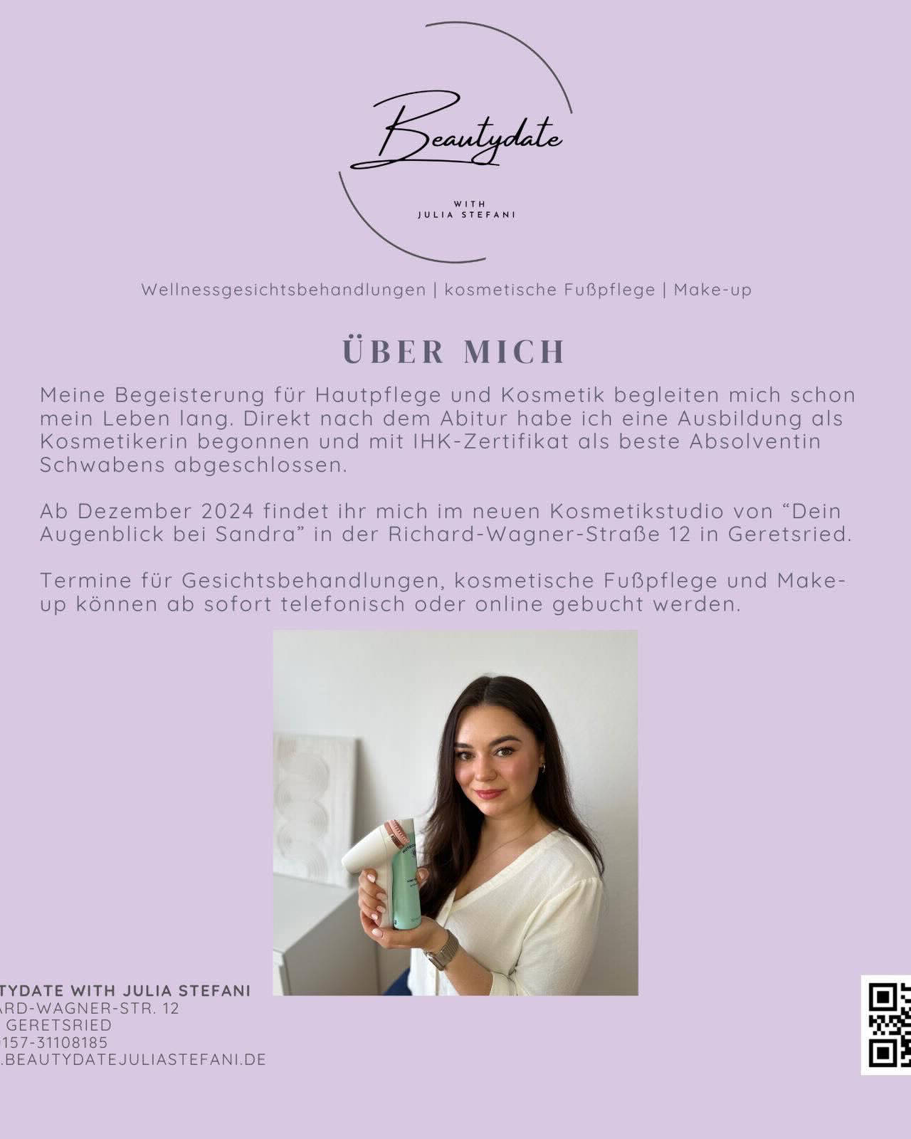 Deine Expertin für Color, Style und Beauty in Geretsried. Bei mir findest du ganzheitliche Kosmetikdienstleistungen mit Herz – von klassischen Wellnessgesichtsbehandlungen mit entspannender Massage oder porentiefer Ausreinigung, über Pediküre mit Nagellack oder UV-Lack, bis hin zu typgerechtem Make-up für besondere Anlässe und Bräute. Mein absolutes Herzensthema ist die Color & Style Beratung – hier entdecken wir gemeinsam deine Wow-Farben, die dich zum Strahlen bringen, dir mehr Klarheit, Leichtigkeit und Selbstbewusstsein schenken und dein Inneres nach außen sichtbar machen. Denn Farben können so viel mehr, als wir denken! Ich lege großen Wert auf persönliche Betreuung, ehrliche Beratung und ein Wohlfühl-Erlebnis – damit du dich nicht nur schön fühlst, sondern auch gesehen und verstanden. Lass uns gemeinsam deine Schönheit zum Leuchten bringen. Ich freu mich auf dich! ÜBER MICH Meine Begeisterung für Kosmetik und Make-up begleiten mich schon mein Leben lang. Direkt nach dem Abitur habe ich eine Ausbildung als Kosmetikerin begonnen und mit IHK-Zertifikat als beste Absolventin Schwabens abgeschlossen. Seit Dezember 2024 findet ihr mich im neuen Kosmetikstudio von "Dein Augenblick bei Sandra" in der Richard-Wagner-Straße 12 in Geretsried.