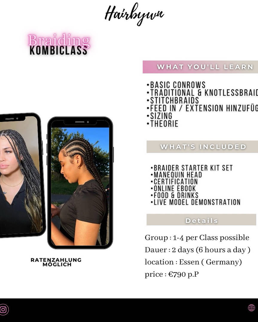 Hey ich bin die Braidedbywn und möchte dir gerne das Flechten bei bringen 💓 Dies ist ein toller Start für Eltern, Jungs und Mädels, die gerne das Flechten lernen möchten! Die Kurse sind auch perfekt für die, die ihr Handwerk verbessern möchten. Wähle zwischen Conows oder Braids, oder möchtest du vielleicht 2 Kurse an 2 Tagen abschließen? Vielleicht kannst du auch schon flechten und möchtest in den Perfektionskurs. Möchtest du wissen, wie du mit der Haarstruktur deines Kindes umgehst? Und es dir selbst erleichtern Dann melde dich jetzt an!
