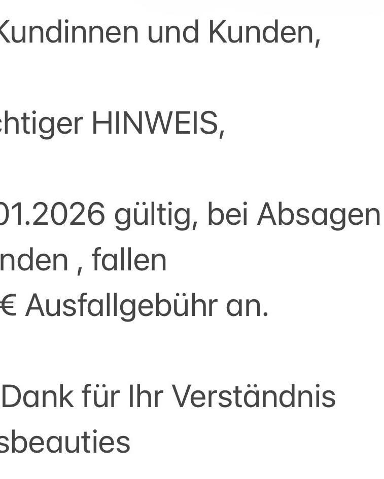 BITTE LESEN Hallo ich bin Sabina, deine Beauty-Stylistin und Ansprechpartner 🌸 Sabi‘s Beauties ist ein kleines Beautystudio in Grafing bei München 🌺 Genieße Deine wertvolle Zeit. Überzeuge Dich selbst! Ich biete beste Qualität mit langjähriger Erfahrung in der Beauty- und Modewelt und die neuste Technologie mit Marken wie Purebeau , Pink Cosmetics oder Jolifin. Ich freue mich Dich bald in meinem Salon begrüßen zu dürfen und mit Dir eine wunderschöne Zeit zu verbringen! Bei Absagen gilt: Liebe Kundinnen und Kunden, ein wichtiger HINWEIS, ab 01.01.2026 gültig, bei Absagen unter 24 Stunden, fallen 30,00 € Ausfallgebühr an. Vielen Dank für Ihr Verständnis🌺 Besuch uns auf Instagram und Facebook: @sabisbeauties Liebe Grüße💋