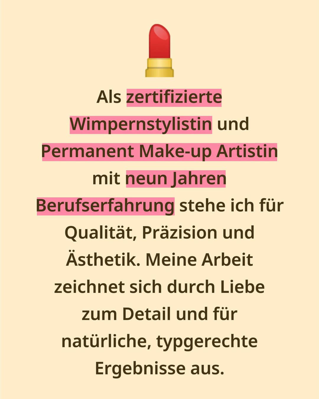 Als zertifizierte Wimpernstylistin und Permanent Make-up Artistin mit neun Jahren Berufserfahrung stehe ich für Qualität, Präzision und Ästhetik. Meine Arbeit zeichnet sich durch Liebe zum Detail und ein geschultes Auge für natürliche, typgerechte Ergebnisse aus. Mein Ziel ist es, jede Kundin individuell zu beraten und ihre Schönheit dauerhaft zu unterstreichen.