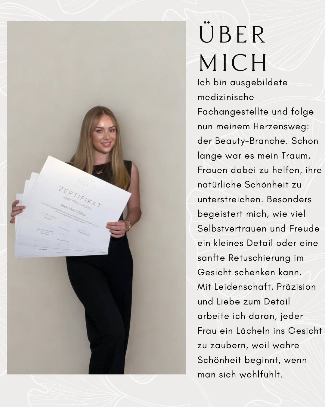 ✨ Hallo, ich bin Alexandra Beauty-Artistin und Gründerin von Softlines Beauty. Es war schon immer mein Traum, im Beauty Bereich zu arbeiten und heute darf ich meine Leidenschaft leben. Mein Ziel ist es, jede Kundin mit professionellen Behandlungen glücklich zu machen und ihre natürliche Schönheit zu unterstreichen. Von Permanent Make-up bis hin zu kosmetischen Behandlungen bei mir stehst du im Mittelpunkt. Mit viel Liebe zum Detail, hochwertigen Produkten und einem hohen Anspruch an Qualität sorge ich dafür, dass du dich rundum wohlfühlst und deine Ausstrahlung zum Leuchten bringst. Ich freue mich darauf, dich kennenzulernen und gemeinsam deinen persönlichen Beauty-Look zu kreieren. 💖