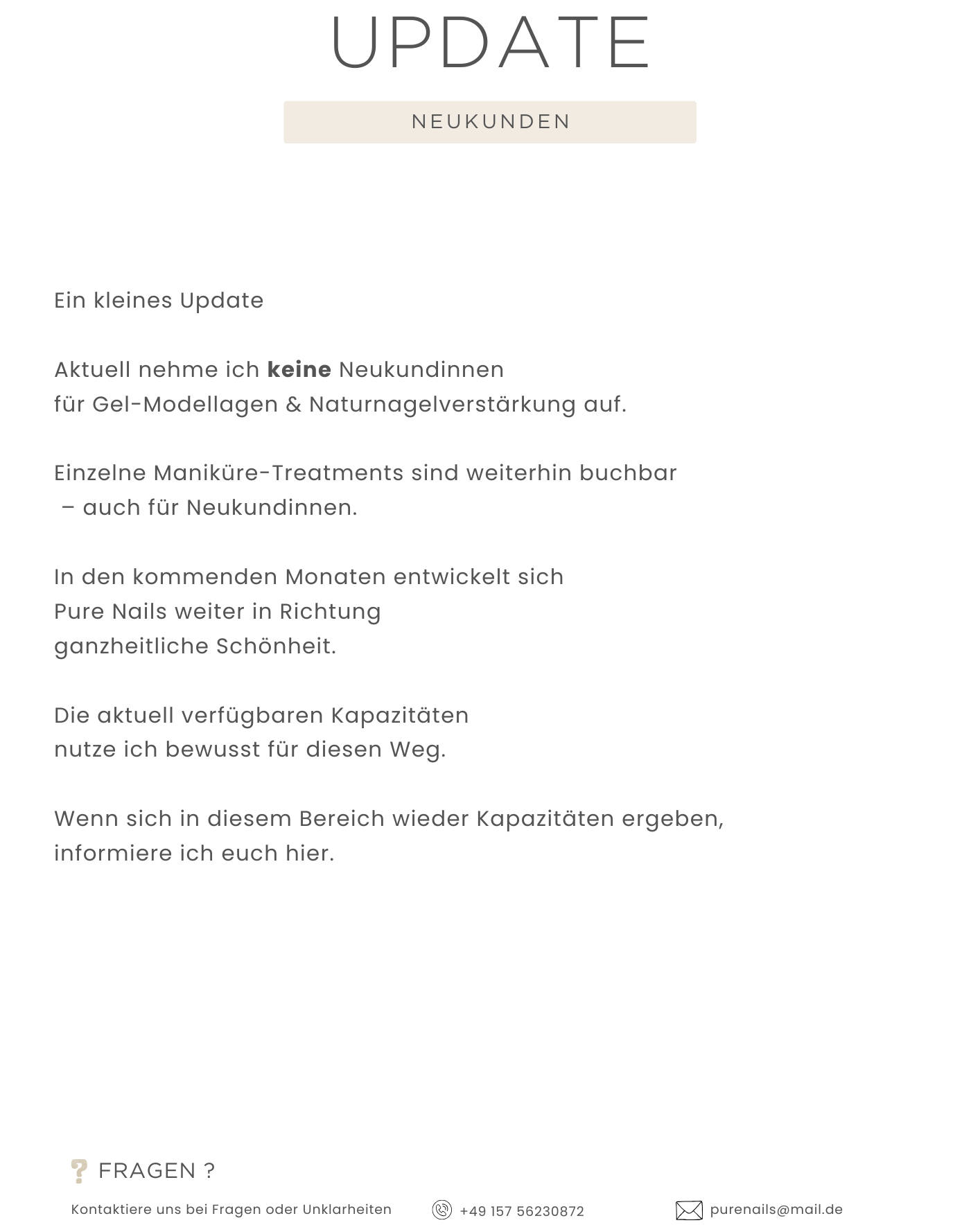 Pure Nails – dein kleiner Rückzugsort für Schönheit und Wohlbefinden in Papenburg ⚜️ Gönn dir einen Moment nur für dich – bei Pure Nails erwarten dich Ruhe, Wärme und liebevoll ausgewählte Details, die sofort ein Gefühl von Luxus und Gemütlichkeit vermitteln. Hier wird jedes Treatment zu einem persönlichen Erlebnis: makellose Nägel, russische Maniküre oder ein Korean Lash & Brow Lift – alles mit Präzision, Leidenschaft und viel Liebe zum Detail. Zwischen sanften Naturtönen, Kerzenschein und Boho-Charme kannst du loslassen, durchatmen und dich einfach rundum verwöhnen lassen. Bei Pure Nails verschmilzt Eleganz mit Komfort – ein Ort, an dem Schönheit und Wohlbefinden Hand in Hand gehen. Ich freue mich darauf, dich bald bei mir willkommen zu heißen und dir deine kleine Auszeit zu schenken. Info: Aktuell nehme ich leider keine Neukunden im Bereich Gel Nägel auf. Maniküre Treatments können weiterhin gebucht werden. Sobald sich wieder Kapazitäten ergeben, lasse ich es euch wissen.