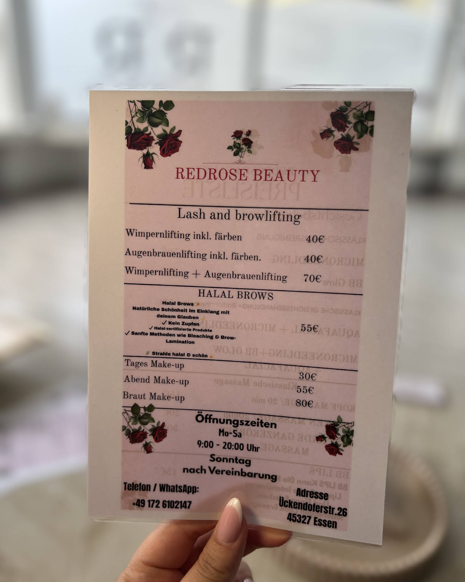 Hallo meine Beauty Maus willkommen bei RedRose Beauty lass dich verzaubern nimm dir Zeit für dich und deine Schönheit eine kleine Auszeit für dich und deine Seele Augenbrauen und Wimpern färben Lash and browlifting halal brows • Microneddling • BB Glow • - BB Lips • Microdermabrasion • Anti-Aging Behandlung • aquafacial - • Klassische Massage : • Gesichts-, Hals-, Dekolleté- und Nackenmassage • maderotherapie • make-up • kopfmassage e-mail redrosebeauty@outlook.de ich komme aus essen und biete dir wunderschöne Gesichtsbehandlungen an und sehr entspannte Massagen für dein Wohlbefinden