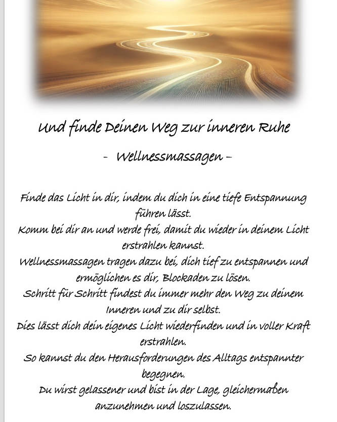 Erfahre mehr über mich Seit 2008 beschäftige ich mich intensiv mit persönlicher Entwicklung und den Zusammenhängen zwischen Körper, Geist und Seele. Damals durfte ich erfahren, wie stark unsere inneren Themen sich auf das körperliche Wohlbefinden auswirken können – und wie tiefgreifend energetische Arbeit zur Heilung beitragen kann. Mein Weg führte mich zur Reiki-Einweihung – und mit ihr zu der Erkenntnis, dass ich mediale Fähigkeiten in mir trage. Durch diese Arbeit durfte ich selbst erfahren, was es bedeutet, innere Balance, Leichtigkeit und Lebensfreude wiederzufinden. Im Laufe der Jahre habe ich mein Wissen ständig erweitert und mich zusätzlich in verschiedenen Massagetechniken weitergebildet. So kann ich heute ganz individuell auf meine Kundinnen und Kunden eingehen – ob Sie Entspannung, energetische Unterstützung oder neue Kraft suchen. Eine besondere Lebensphase erlebte ich 2020 mit meiner eigenen Corona- und Long-Covid-Erfahrung. Diese Zeit hat mich gelehrt, achtsamer mit mir umzugehen und meine Werkzeuge der Selbsthilfe noch bewusster einzusetzen. Dieses Wissen gebe ich heute mit großem Mitgefühl weiter. Meine Arbeit ist für mich mehr als ein Beruf – sie ist meine Berufung. Ich begleite Menschen dabei, wieder in ihre Mitte zu kommen, sich selbst zu spüren und in allen Bereichen des Lebens mehr Wohlbefinden zu erfahren. Ich freue mich darauf, auch Sie auf Ihrem Weg zu begleiten – mit Herz, Erfahrung und einer Prise Lebensfreude. 💫