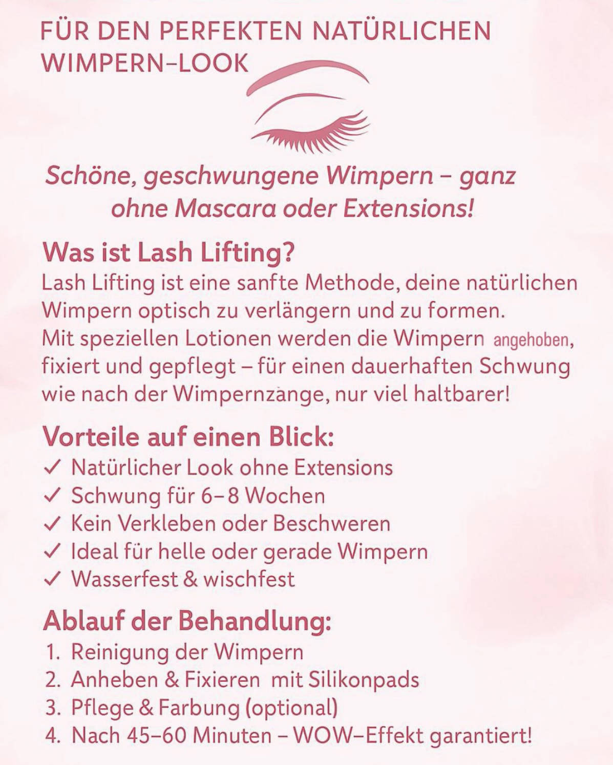 Du wünschst dir natürlich geschwungene, lange und ausdrucksstarke Wimpern – ganz ohne Wimpernzange oder Extensions? Dann ist mein Wimpernlifting genau das Richtige für dich! Ab sofort biete ich dir diese sanfte, aber wirkungsvolle Beauty-Behandlung an, bei der deine eigenen Wimpern sichtbar verlängert und geliftet werden. Das Ergebnis: 👁️ Offener Blick 🌿 Natürlich schöne Wimpern 💧 Wasser- und wischfest 💫 Bis zu 6 Wochen Halt Buche jetzt deinen Termin und erlebe den Wow-Effekt – ganz ohne Mascara! Ich freue mich auf dich!💕