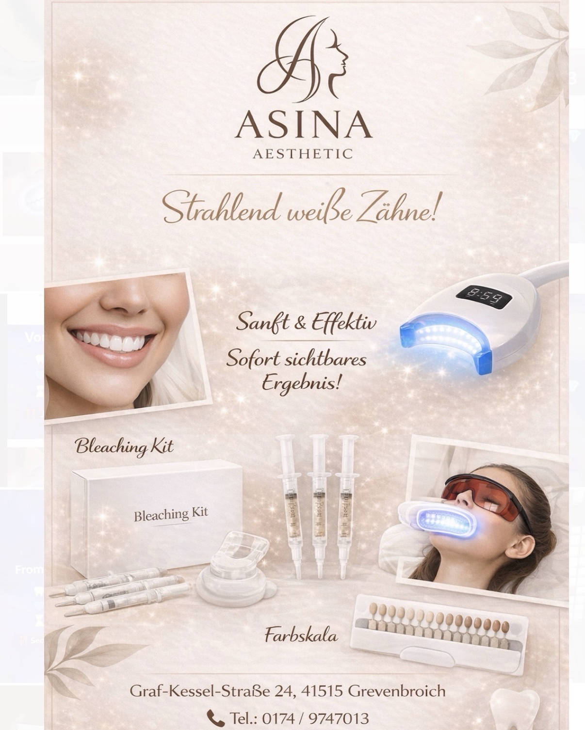 Asina Aesthetic – Dein strahlendes Lächeln beginnt hier! ✨ Ein schönes Lächeln öffnet Türen, stärkt dein Selbstbewusstsein und hinterlässt Eindruck. Bei Asina Aesthetic bringen wir deine Zähne schonend und effektiv zum Strahlen – ganz ohne Schmerzen und ohne Zahnschäden. 🦷 Professionelles Zahnbleaching 🌿 Schonende & sichere Anwendung ⚡ Sichtbare Ergebnisse bereits nach einer Behandlung 💎 Für ein frisches, weißes Hollywood-Lächeln Ob für ein besonderes Event, ein wichtiges Business-Meeting oder einfach für dich selbst – gönn dir das Upgrade für dein Lächeln! 📍 Buche jetzt deinen Termin bei Asina Aesthetic 📩 Schreib uns eine Nachricht oder sichere dir direkt deinen Wunschtermin. Asina Aesthetic – Weil dein Lächeln Luxus verdient.