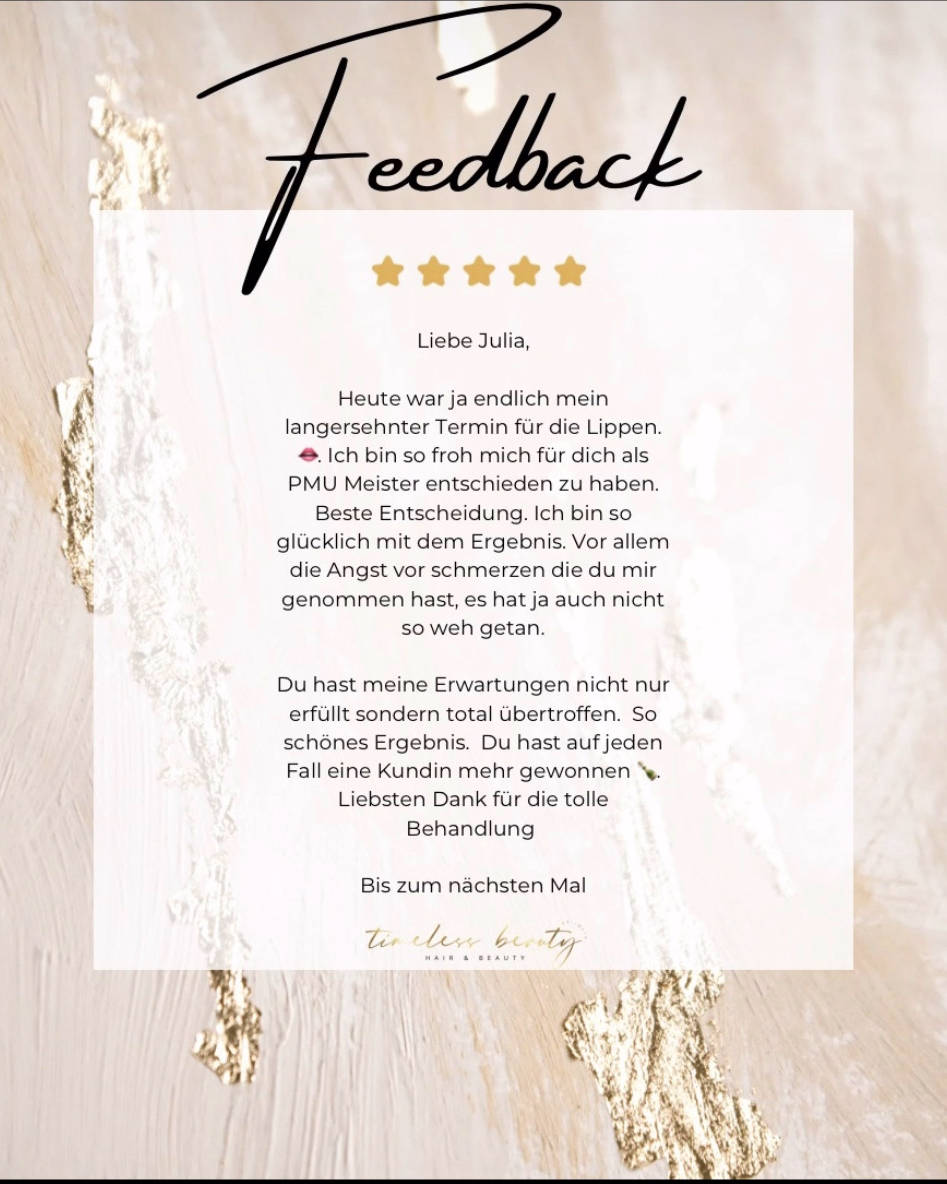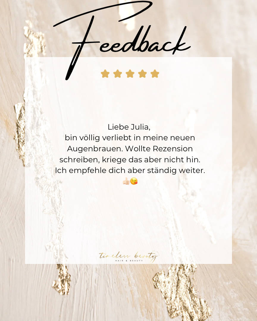 Ich bin wirklich mehr als zufrieden. Es war meine erste Behandlung bei Julia und ich wurde direkt herzlich empfangen. Auch während der kompletten Behandlung war sie sehr fürsorglich und hat einen tollen Job gemacht. Ich freue mich schon aufs nächste Mal!