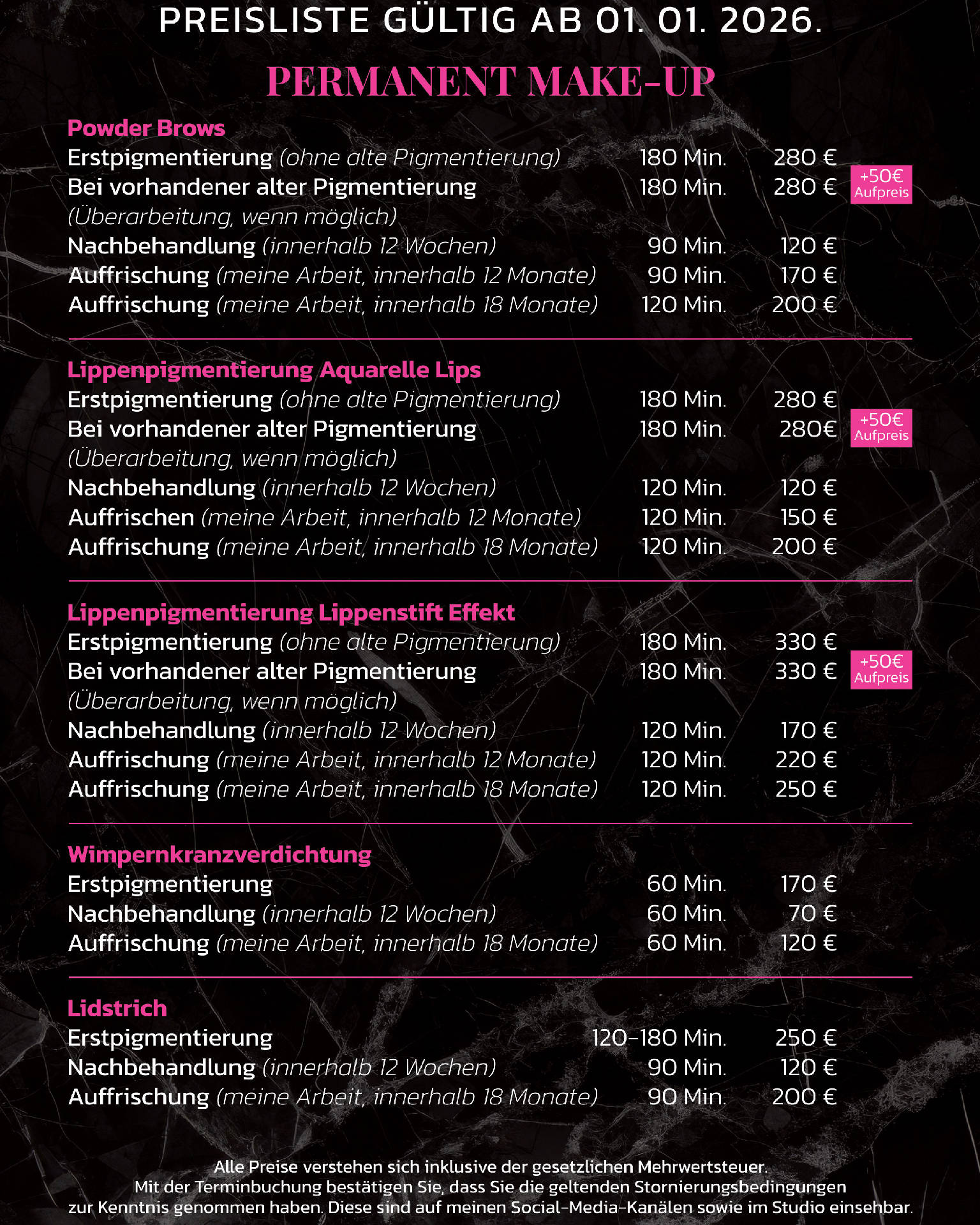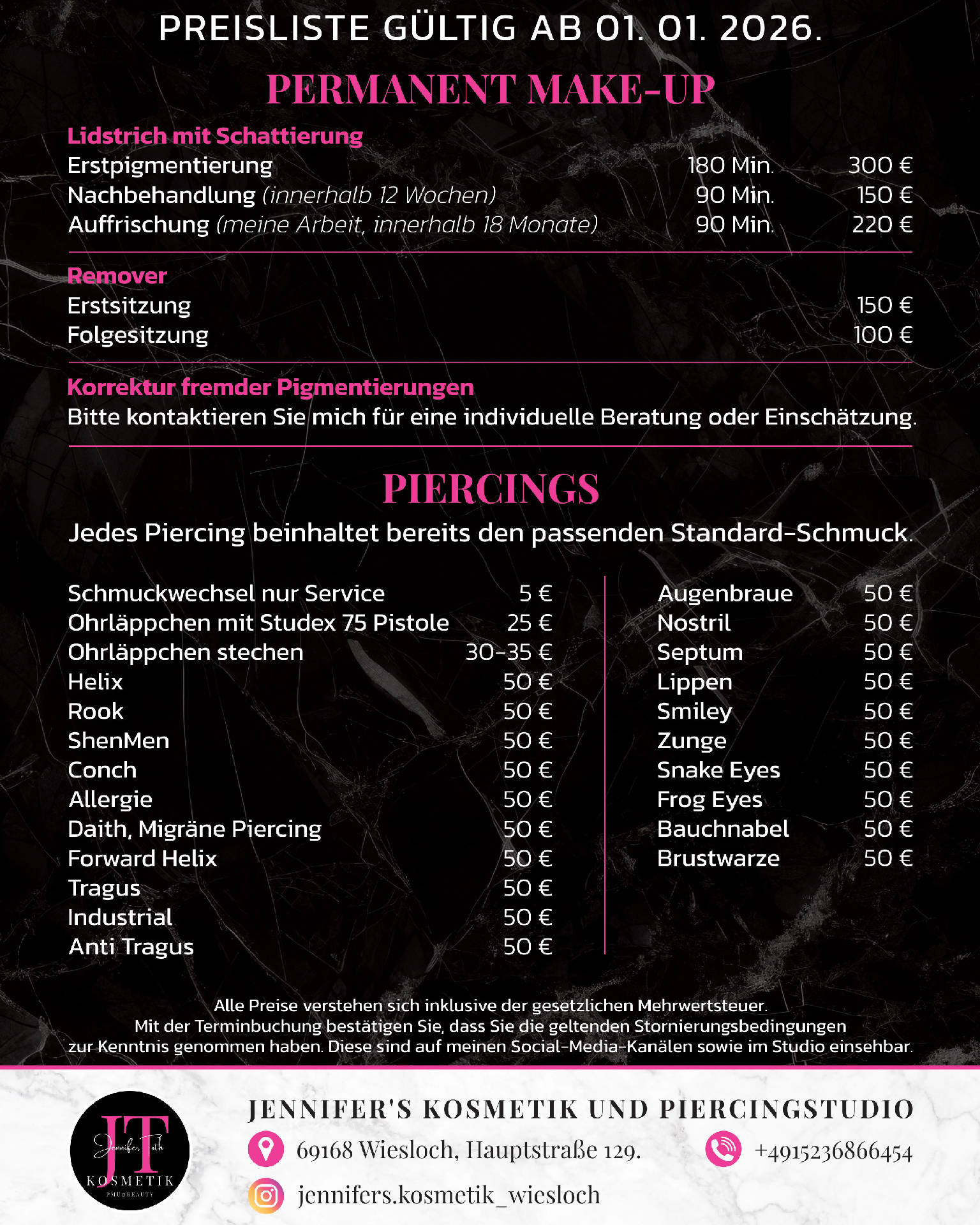 Ich bin Jennifer – ausgebildete Kosmetikerin und Gründerin von Jennifer’s Kosmetik Wiesloch. Mit viel Leidenschaft und Erfahrung helfe ich dir, dich rundum wohl in deiner Haut zu fühlen. Ob Hautpflege, Permanent Make-up oder Piercing – bei mir stehst du im Mittelpunkt. Ich arbeite mit professionellen Produkten von CNC Cosmetic und stimme jede Behandlung individuell auf dich ab. Ich freue mich darauf, dich persönlich kennenzulernen! Der Stammkundenpreis gilt nur für diejenigen, die eine Dienstleistung regelmäßig, alle 3-4-5 Wochen, in Anspruch nehmen. Nur Barzahlung möglich. Ich bitte um Verständnis, dass ich keine EC- oder Kreditkarte akzeptieren kann.