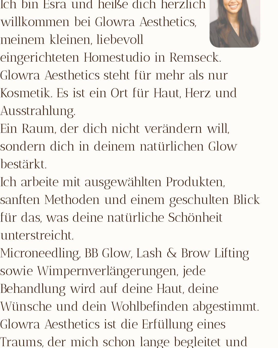 Willkommen bei Glowra Aesthetics ✨ Mein Name ist Esra und ich komme aus Remseck. Schon seit vielen Jahren fasziniert mich alles, was mit Beauty, Hautpflege und Ästhetik zu tun hat. Nach meiner Zeit in der Medizinischen Branche habe ich mich dazu entschieden, meiner Leidenschaft zu folgen und meinen eigenen Weg im Kosmetikbereich zu gehen. Ich habe umfassende Schulungen in den Bereichen Microneedling, BB Glow, Wimpernverlängerung, Lash Lifting und Brow Lifting absolviert und arbeite ausschließlich mit hochwertigen Produkten, die für sichtbare Ergebnisse und Hautverträglichkeit stehen. Was mich ausmacht, ist meine Liebe zum Detail und der Anspruch, jede Behandlung individuell auf die Bedürfnisse meiner Kundinnen und Kunden abzustimmen. Mein Ziel ist es, dass du dich bei mir nicht nur schöner, sondern auch wohler und selbstbewusster fühlst. In meinem Beauty-Room in Remseck erwartet dich eine entspannte, moderne Atmosphäre, in der du dir eine Auszeit vom Alltag gönnen kannst. 🌸 Ich freue mich darauf, dich kennenzulernen und gemeinsam deinen ganz persönlichen Glow zu kreieren.
