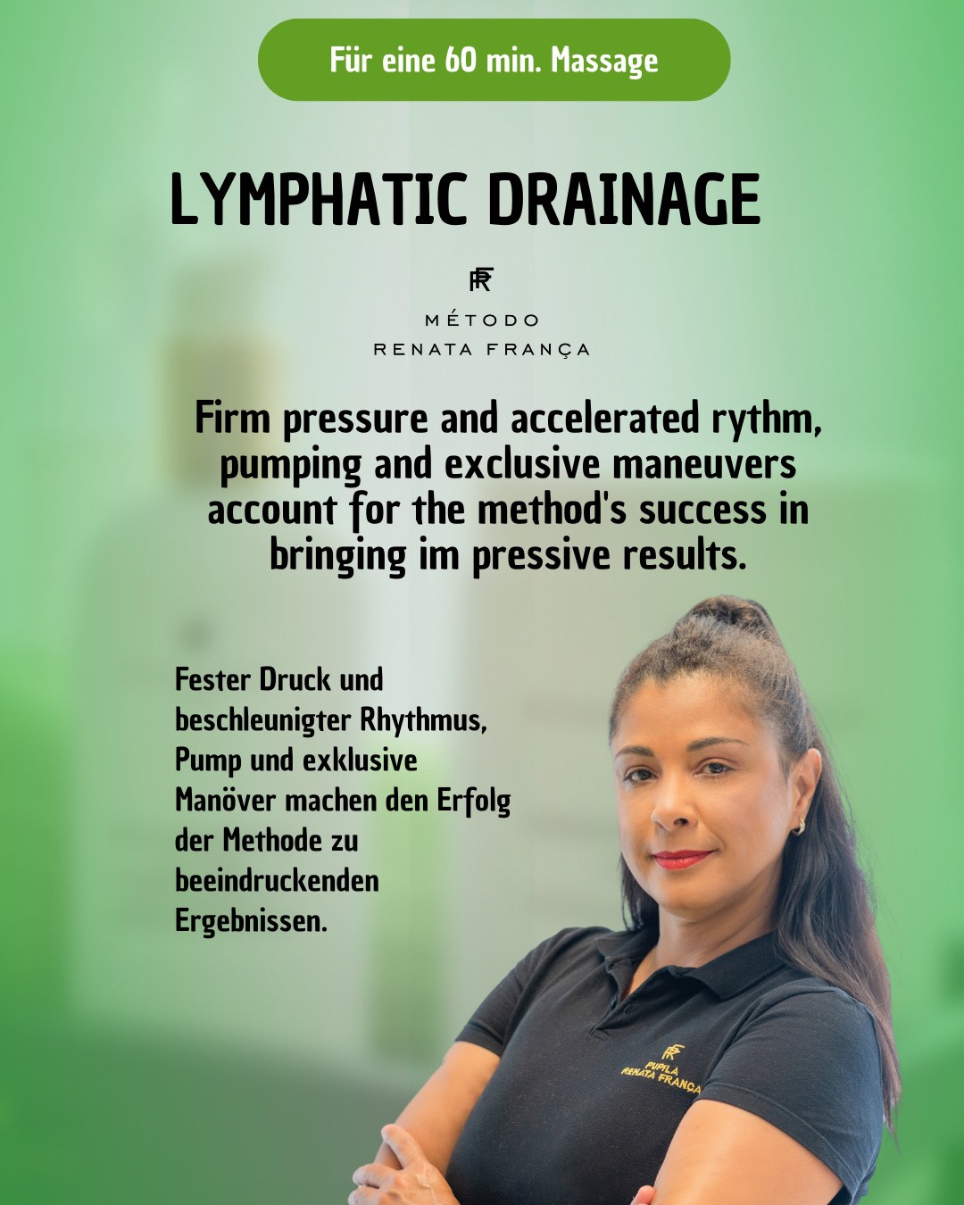 📌Born in Rio 1971 📌Emigration nach Stuttgart 1998🇩🇪 📌Kosmetikerin seit 2009 📌Massagetherapeutin 📌Alternative Medizin in Training 2020 📌Expertin in allen Massage nach 📌Renata França Methode Kosmetik bedeutet für mich vor allem Entspannung und Genuss für Körper und Seele. Entspannen Sie sich bei meinen außergewönlichen Behandlungen, mit kompetenten Händen und hochwertigen Produkten.