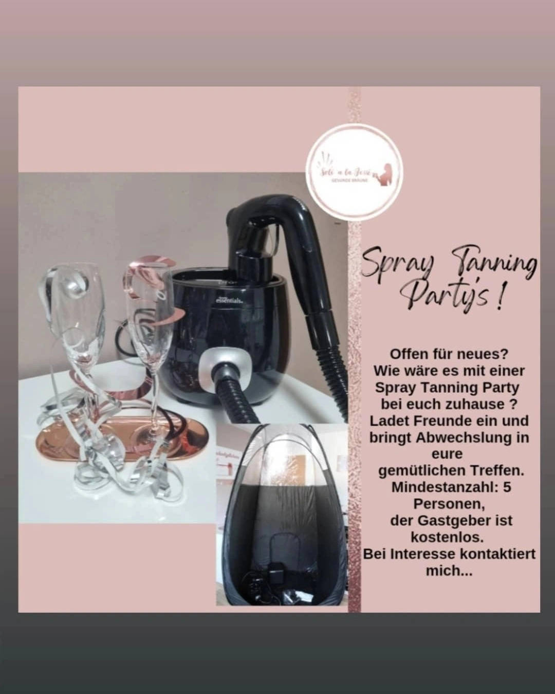 Hola, mein Name ist Jessica (Jessi) – Profi Spray Tanning Artistin. Ich bin gebürtige Spanierin und seit 2020 ausgebildete Spray Tanning Artistin. Ich biete euch eine gesunde Alternative zum Solarium: natürliche, gleichmäßige Airbrush-Bräune, die keine gesundheitlichen Risiken birgt. Die Bräune hält ca. 7–10 Tage, je nach Hauttyp und Pflege, und verblasst gleichmäßig – kein Orange! Mein Homestudio in Bottrop ist individuell eingerichtet, Termine sind nach Vereinbarung möglich. Mobil buchbar – ich komme auch zu dir Spray Tanning Party buchbar ab 5 Personen Ideal für Events, Partys, Hochzeiten, Shootings, Urlaub, Schwangere, Abiball, Wettkämpfe u.v.m. Folge mir auf Instagram: sole.a.la.jessi WhatsApp für Termine: 0176 2470 2623