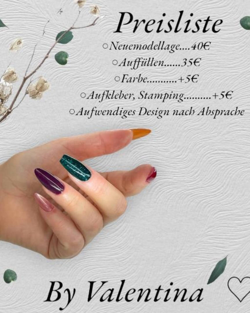 Willkommen in meinem Nagelstudio! 💖 In meinem Studio dreht sich alles um schöne, gepflegte Nägel und dein Wohlbefinden. Ob Neumodellage, Auffüllen oder individuelles Design – ich arbeite präzise, hygienisch und ganz nach deinen Wünschen, damit du dich rundum wohlfühlst. ✨ Mein Ziel: Du verlässt mein Studio mit perfekten Nägeln und einem guten Gefühl! 💅 Wichtige Info – bitte lesen 🥰 Termine müssen mindestens 12 Stunden vorher abgesagt oder verschoben werden. Bei kurzfristiger Absage oder Nichterscheinen werden 70 % des Behandlungspreises berechnet. In Ausnahmefällen kannst du dich gerne persönlich bei mir melden – wir finden gemeinsam eine Lösung. Mit der Buchung eines Termins erklärst du dich mit dieser Regelung einverstanden. Alle weiteren Infos zur Vorbereitung und Bezahlung findest du weiter unten im Profil – bitte schau sie dir vor deinem Termin kurz an. 💖