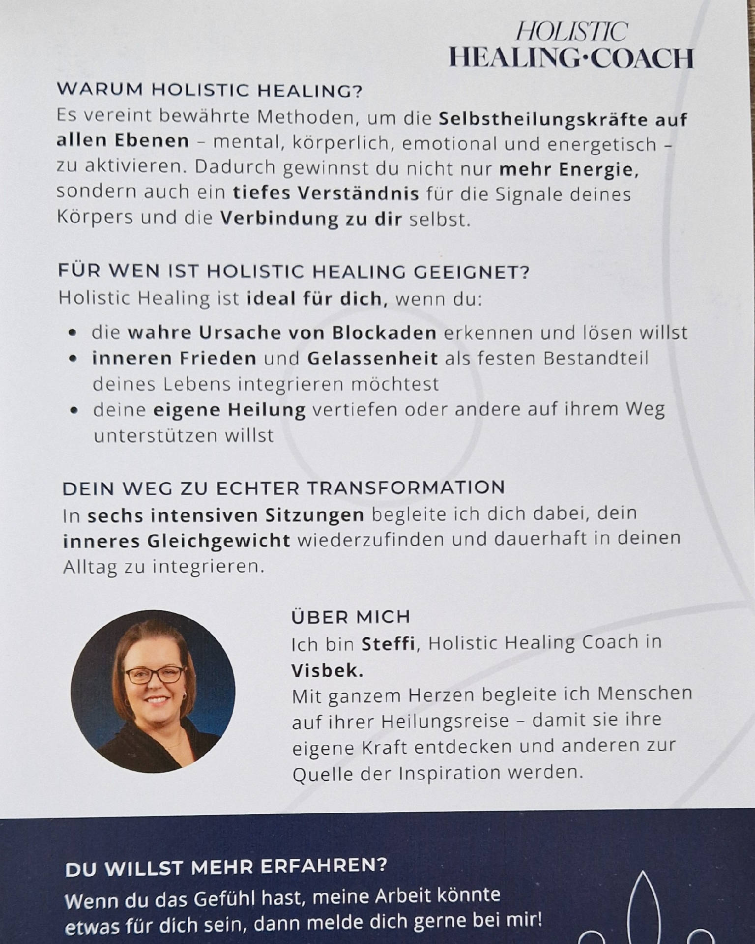 Ich bin 44 Jahre alt und zuhause im schönen Visbek. Wie viele Menschen kenne auch ich kleine und größere Beschwerden, die man gerne ignoriert. Eine belastende Krankheit hat mir gezeigt, wie wichtig ein ganzheitlicher Blick auf die eigene Gesundheit ist. So begann meine Reise zu Holistic Healing, Reiki und anderer energetischer Arbeit. Heute sehe ich darin ein Geschenk und begleite Menschen, die sich in einer ähnlichen Phase befinden.