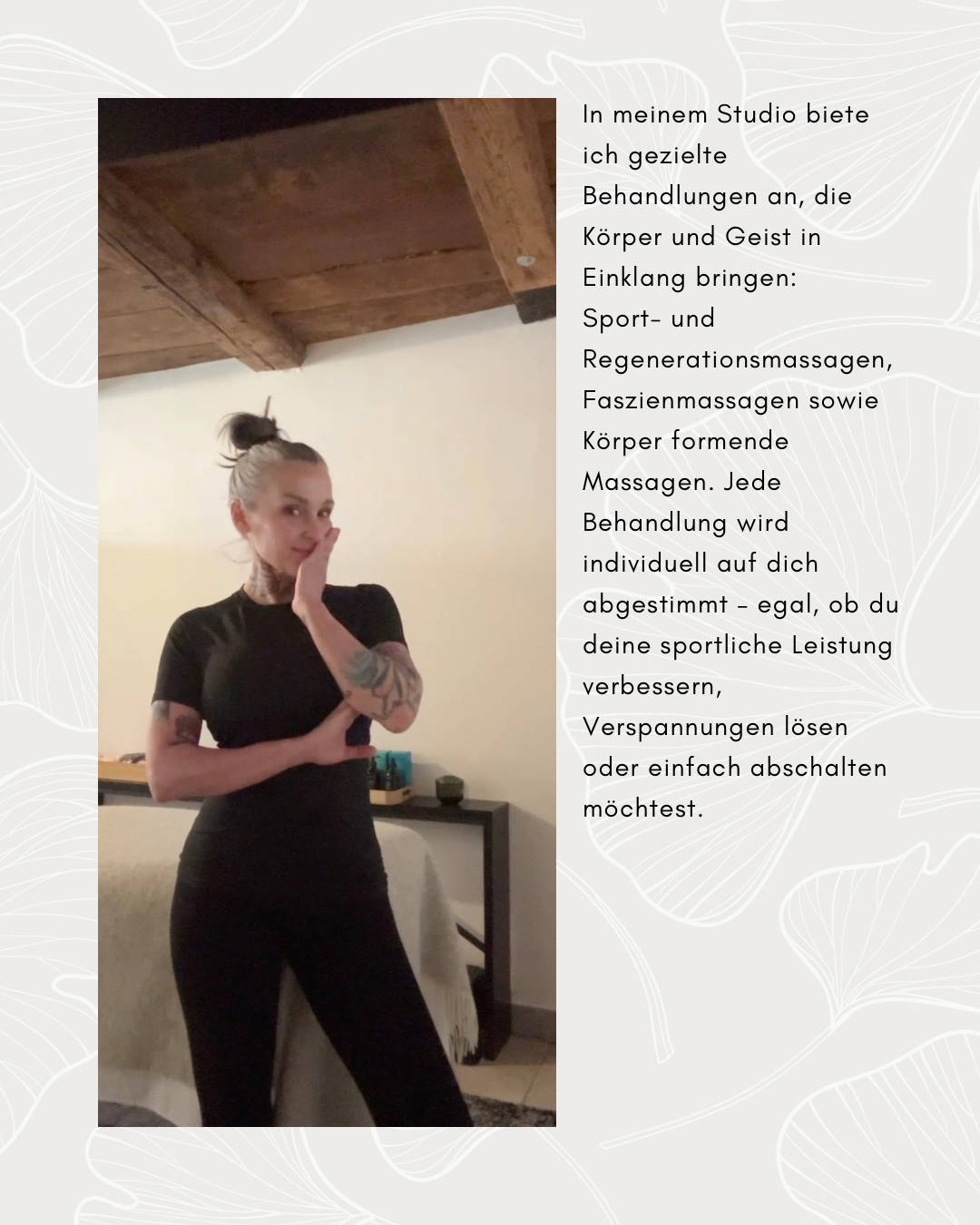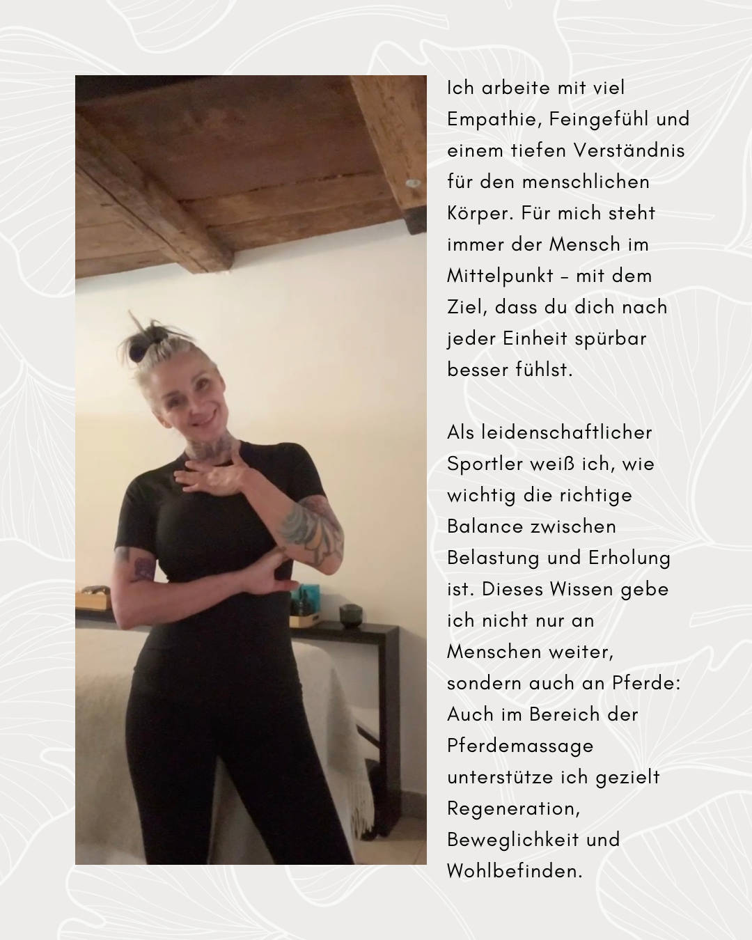 Dein Ort für Regeneration, Leistung & Wohlbefinden Seit über 12 Jahren begleite ich Menschen als Personal Trainer auf ihrem Weg zu mehr Leistungsfähigkeit, Gesundheit und innerer Balance. Aktuell befinde ich mich in den letzten Zügen meiner Ausbildung zum Sporttherapeuten – mein Ansatz verbindet fundiertes Fachwissen mit echter Leidenschaft für Bewegung und Regeneration. In meinem Studio biete ich gezielte Behandlungen an, die Körper und Geist in Einklang bringen: Sport- und Regenerationsmassagen, Faszienmassagen sowie Körper formende Massagen. Jede Behandlung wird individuell auf dich abgestimmt – egal, ob du deine sportliche Leistung verbessern, Verspannungen lösen oder einfach abschalten möchtest. Ich arbeite mit viel Empathie, Feingefühl und einem tiefen Verständnis für den menschlichen Körper. Für mich steht immer der Mensch im Mittelpunkt – mit dem Ziel, dass du dich nach jeder Einheit spürbar besser fühlst. Als leidenschaftlicher Sportler weiß ich, wie wichtig die richtige Balance zwischen Belastung und Erholung ist. Dieses Wissen gebe ich nicht nur an Menschen weiter, sondern auch an Pferde: Auch im Bereich der Pferdemassage unterstütze ich gezielt Regeneration, Beweglichkeit und Wohlbefinden. Für mehr Leichtigkeit, mehr Energie und ein besseres Körpergefühl.