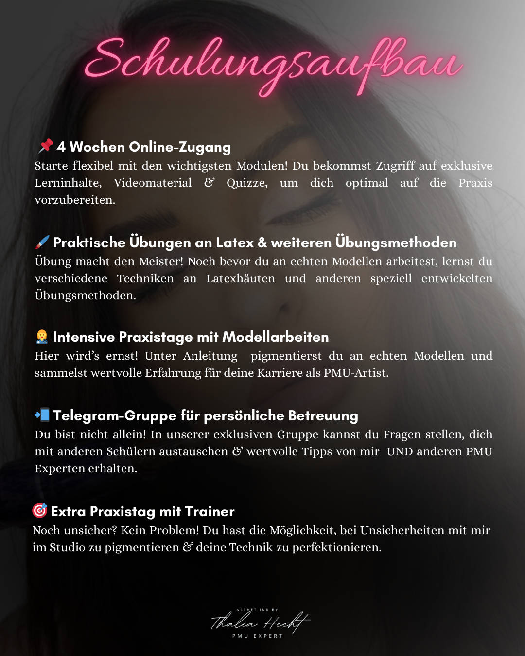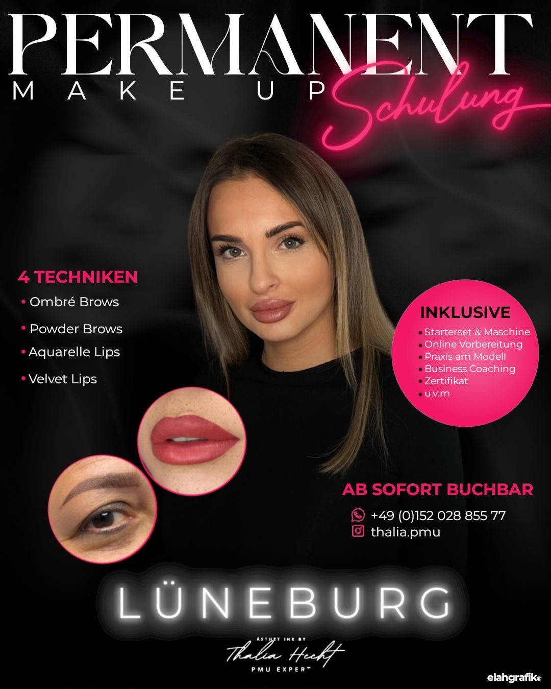 Hey, ich bin Thalia ✨ Ich komme aus Lüneburg und habe ursprünglich als Krankenschwester gearbeitet. Irgendwann habe ich gemerkt, dass ich mich beruflich verändern möchte und den Wunsch hatte, etwas Eigenes aufzubauen. Ich habe im Bereich Permanent Make-up bei null angefangen – ohne Studio, ohne großes Netzwerk, aber mit viel Lernbereitschaft, Disziplin und Leidenschaft für präzise Arbeit. Heute arbeite ich als PMU Artistin mit Fokus auf natürliche, ästhetische Ergebnisse und hochwertige Pigmente. Neben Behandlungen für Kundinnen gebe ich mein Wissen im Rahmen meiner Academy an PMU Artists weiter – praxisnah, ehrlich und mit einem klaren Qualitätsanspruch. Mein Ziel ist es, Menschen zu begleiten, die Wert auf saubere Arbeit, Weiterentwicklung und Vertrauen legen.