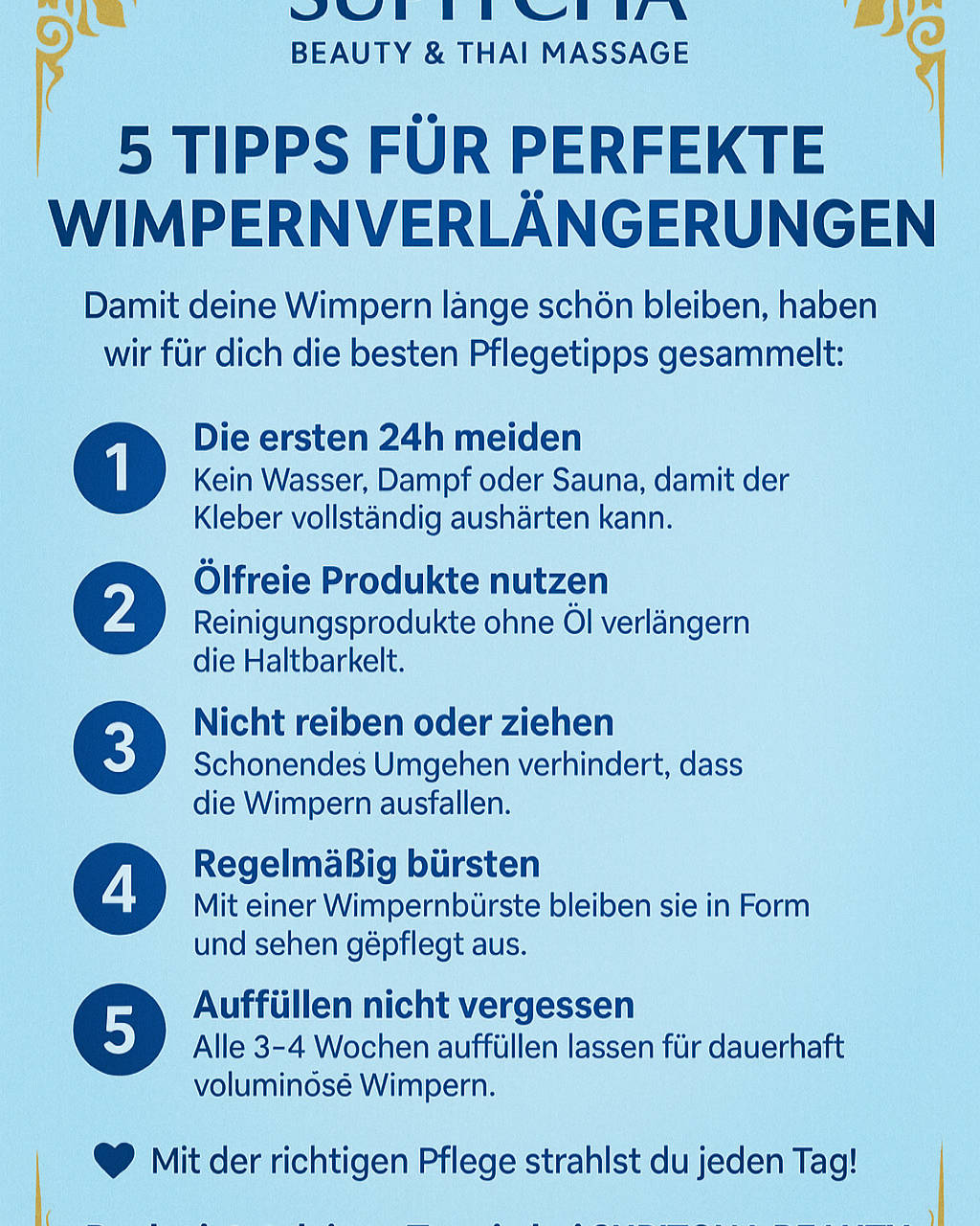💖 Über mich Mit Herz, Erfahrung und Leidenschaft für Schönheit & Entspannung Mein Name ist Supitcha, und ich bin die Inhaberin von Supitcha Beauty Thai Massage in Braunschweig. Ich komme ursprünglich aus Thailand, wo ich die Kunst der traditionellen Thai-Massage und ganzheitlichen Körperpflege von Grund auf erlernt habe. Schon früh entdeckte ich meine Leidenschaft dafür, Menschen zu mehr Wohlbefinden, innerer Ruhe und äußerer Schönheit zu verhelfen. Nach meiner Ausbildung und mehreren Jahren Berufserfahrung in renommierten Spas und Beauty-Studios entschied ich mich, meinen Traum zu verwirklichen: Einen eigenen Ort zu schaffen, an dem ich Menschen individuell, achtsam und mit echter Hingabe behandeln kann. So entstand Supitcha Beauty Thai Massage – mein persönlicher Wohlfühlort mitten in Braunschweig. Ich bin zertifizierte Thai-Masseurin und Beauty-Spezialistin mit langjähriger Erfahrung in: • Traditioneller Thai-Massage • Aromaöl-, Rücken- und Fußreflexzonenmassagen • Professioneller Wimpernverlängerung und -verdichtung • Maniküre, Pediküre & Naildesign • Permanent Make-up & Beauty-Treatments Durch regelmäßige Weiterbildungen bleibe ich immer auf dem neuesten Stand – sowohl in der klassischen thailändischen Massagekunst als auch in modernen Beauty-Techniken.