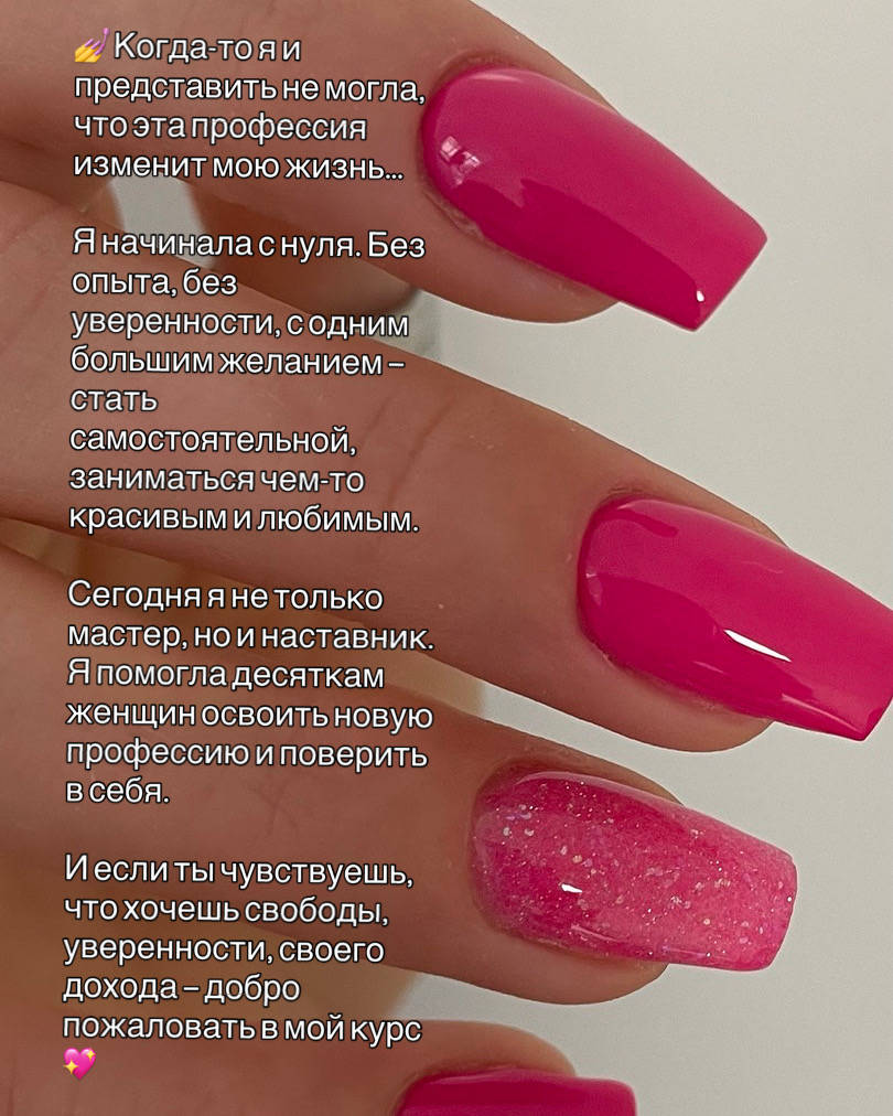 Meine Tätigkeit: Ich arbeite als selbständige Nageldesignerin und Kosmetikerin. Zu meinen Aufgaben gehören Maniküre, Pediküre, Nagelmodellage sowie individuelle Beratung der Kundinnen über Pflege und Produkte. Darüber hinaus erstelle ich Online-Kurse für angehende Nageldesignerinnen, in denen ich Fachwissen, Techniken und Business-Tipps vermittle.