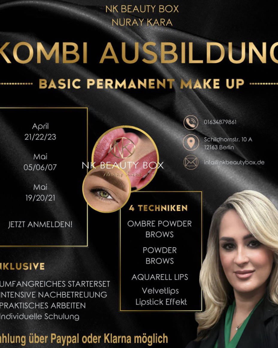 Willkommen bei NK Beauty Box Berlin by Nuray Kara, Ihrem Kosmetik- und Schönheitsstudio im Herzen von Berlin. Wir sind ein Team von erfahrenen Kosmetikerinnen und Permanent Make-up Artists, die sich leidenschaftlich dafür einsetzen, das Beste aus Ihrem Aussehen herauszuholen. Unser Ziel ist es, Ihnen ein einzigartiges Schönheitserlebnis zu bieten, das auf Ihre individuellen Bedürfnisse und Wünsche zugeschnitten ist. Unser umfangreiches Angebot an Schönheitsbehandlungen umfasst Microdermabrasion, Aquafacial, Ultraschall-Gesichtsbehandlung, Skin Scrubber, Fruchtsäurepeeling, Glow Peel, Augenbrauen- und Wimpernbehandlungen sowie Permanent Make-up und Finelinetattoos. Wir bieten auch verschiedene Make-up-Stile an, von Tages-Make-up über Abend-Make-up bis hin zu Braut-Make-up und Brautfrisuren. Unser Team von qualifizierten und erfahrenen Kosmetikerinnen verfügt über umfangreiche Kenntnisse in der Schönheitsindustrie und nutzt nur die neuesten Technologien und Produkte, um die besten Ergebnisse zu erzielen. Wir sind stolz darauf, Ihnen ein entspannendes und luxuriöses Erlebnis zu bieten, das Sie verjüngt und erfrischt zurücklässt. Wir laden Sie herzlich ein, uns in unserem Studio in Berlin zu besuchen und Ihre Schönheitsbedürfnisse mit uns zu besprechen. Wir freuen uns darauf, Sie kennenzulernen und Ihnen dabei zu helfen, das Beste aus Ihrem Aussehen herauszuholen.