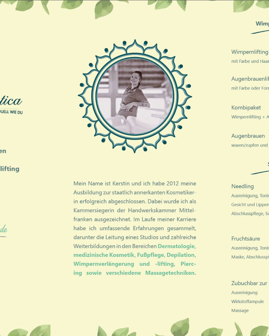 15 Jahre Erfahrung im Bereich Kosmetik und Dermatologie Kosmetik - so individuell wie Du! Stelle dir deine Behandlung zusammen, so wie du es brauchst. Egal ob Wimpern, Füße, Kosmetik oder Waxing