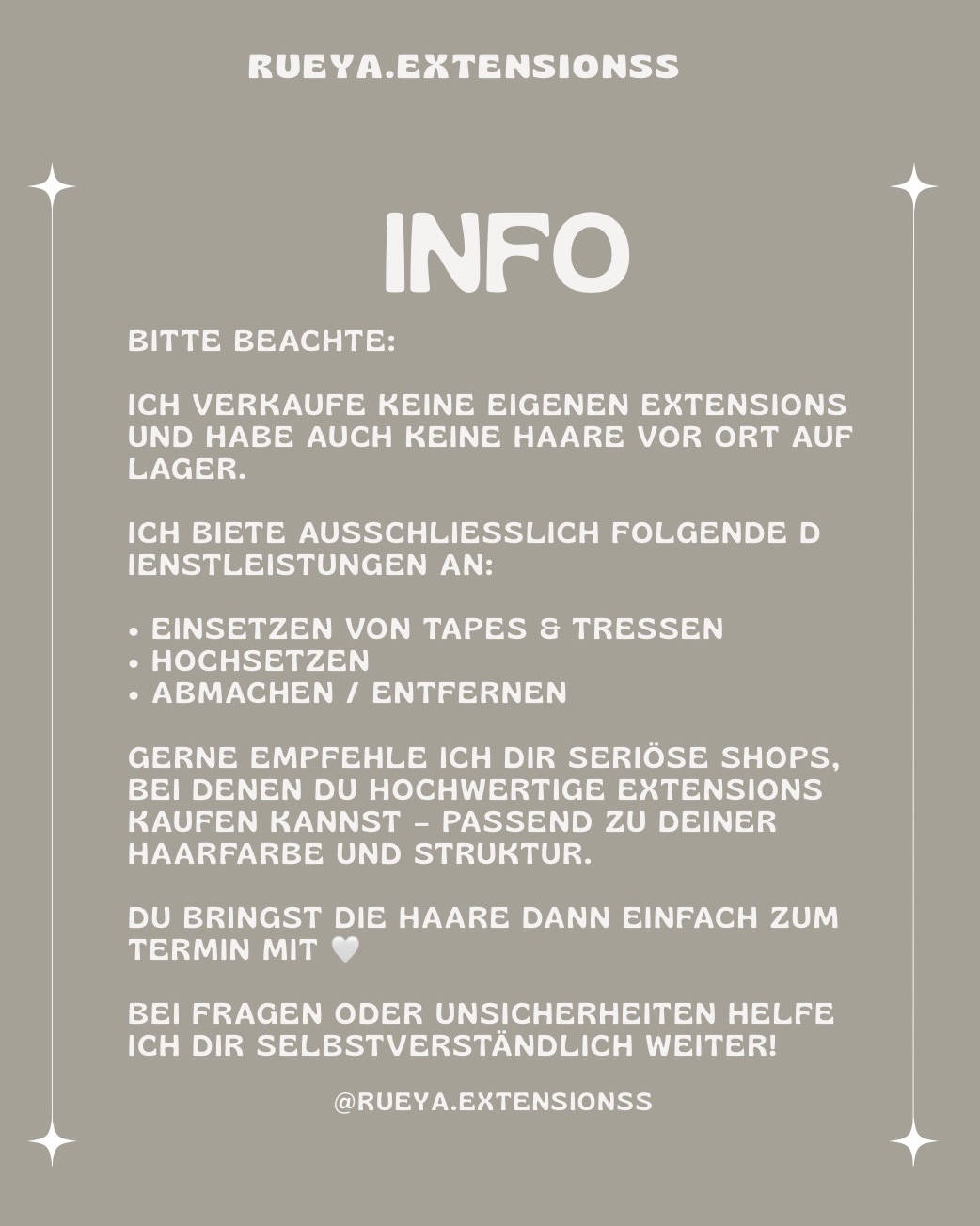 ✨ Rüya.Extensions – Wo Träume Wirklichkeit werden ✨ Hallo ihr Lieben 🤍 Ich bin zertifizierte Hairstylistin aus Hamburg und habe mir mit Rüya.Extensions meinen ganz persönlichen Traum erfüllt – denn „Rüya“ bedeutet in vielen Sprachen Traum. Nach einer kleinen Pause bin ich jetzt wieder mit voller Leidenschaft für euch da! Ich biete Haarverlängerungen in allen Varianten an – ob natürlich, sanfte Auffüllung oder voluminös – gemeinsam finden wir den perfekten Look, der eure Haare wunderschön zur Geltung bringt. Wichtig für euch: Aktuell setze ich ausschließlich eure mitgebrachten Extensions ein. Ich führe selbst keine Haare auf Lager, aber ich empfehle euch sehr gerne hochwertige Marken, damit ihr die perfekte Qualität für euren Traumlook bekommt. Mein Ziel ist es, dass jede Kundin sich nach der Behandlung noch schöner und selbstbewusster fühlt – ganz nach dem Motto: Träume werden wahr, Strähne für Strähne! 💫 📍 Standort: Hamburg 💌 Termine & Infos: gerne direkt hier über Beautinda
